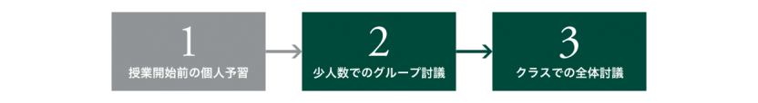 ケースメソッド授業の一般的な進め方は、あるひとつのケースについて、「個人予習」「グループ討議」「クラス討議」の順番に進めるというものです。ディスカッションのサイズを段階的に大きくしながら、より多様な参加者による、より深い議論へと進んでいきます。